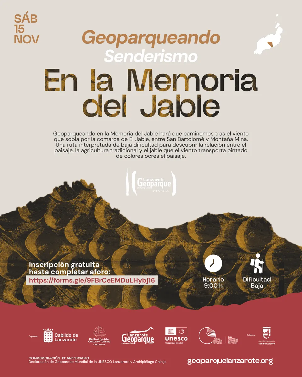 El mar tuvo que retroceder para dejar al descubierto plataformas marinas donde, poco a poco, con la paciencia del tiempo, paciencia incomprensible en nuestra temporalidad humana, pudiera dar origen a lo hoy conocemos como El Jable, uno de los paisajes más singulares de Lanzarote. Geoparqueando en la Memoria del Jable nos invita a ser testigos de este territorio en constante movimiento, donde la arena no solo cubre la tierra, sino también siglos de historia, ingenio y adaptación.